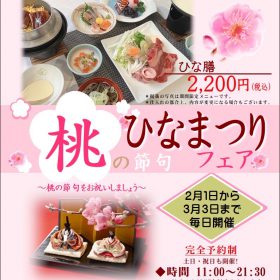 2月は毎年大好評『ひな膳フェア』を開催致します 期間は2月1日~3月3日まで お一人様2200円(税込) 完全予約制となっておりますので、気になる方は…